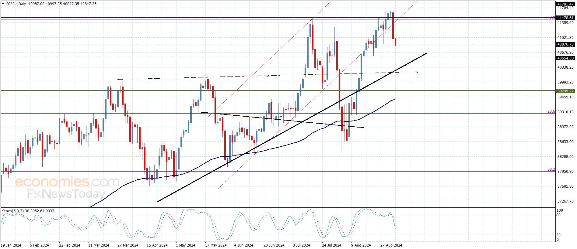 شكّل سعر المؤشر يوم أمس هجوم سلبي قوي بتسلله دون الدعم الإضافي المستقر عند 41470 ليتكبد بذلك خسائر كبيرة بوصوله نحو 40825 كما هو واضح بالرسم المرفق.