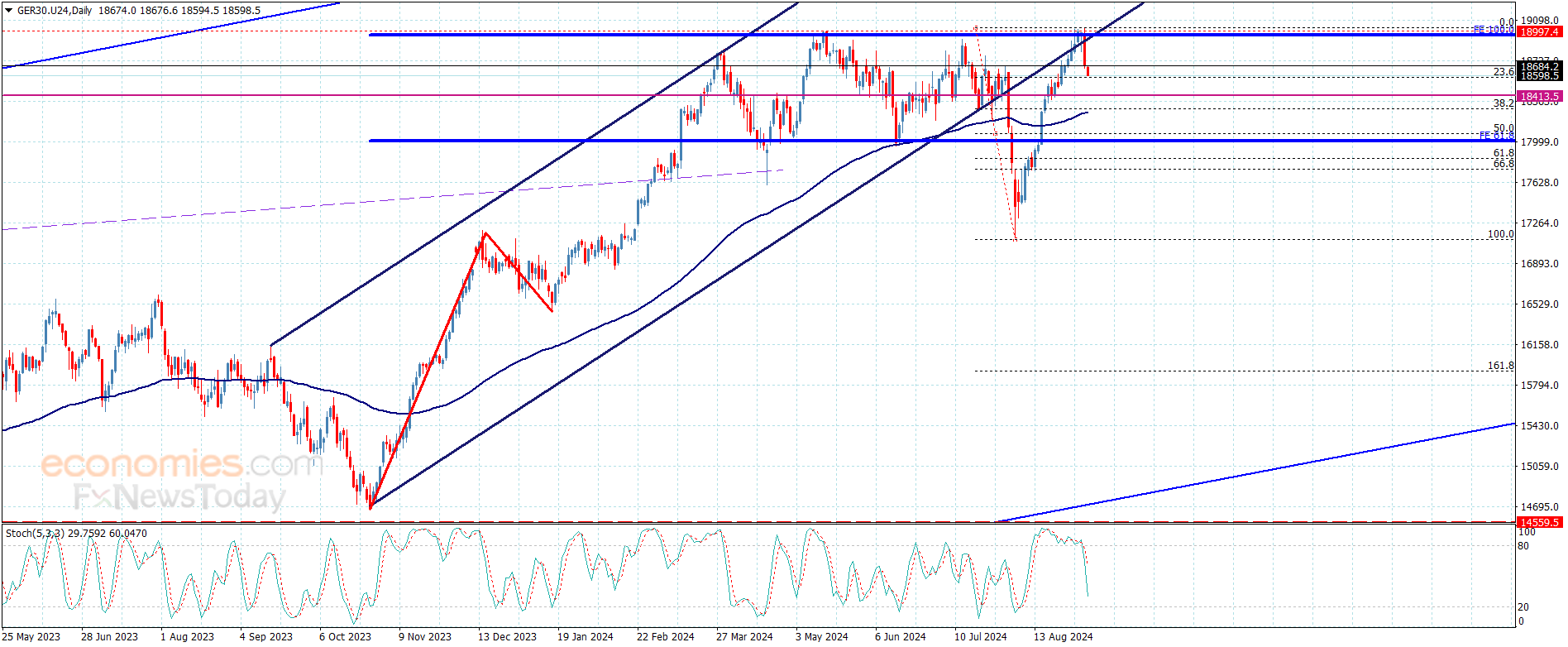 فشل سعر المؤشر بتجاوز القمة التاريخية ليشكل ذلك عامل سلبي قوي لنلاحظ تسلله دون مستوى 18870.00 ليتكبد بذلك خسائر كبيرة بوصوله حاليا نحو مستوى تصحيح 23.6% فيبوناتشي المتمركز عند 18550.00.