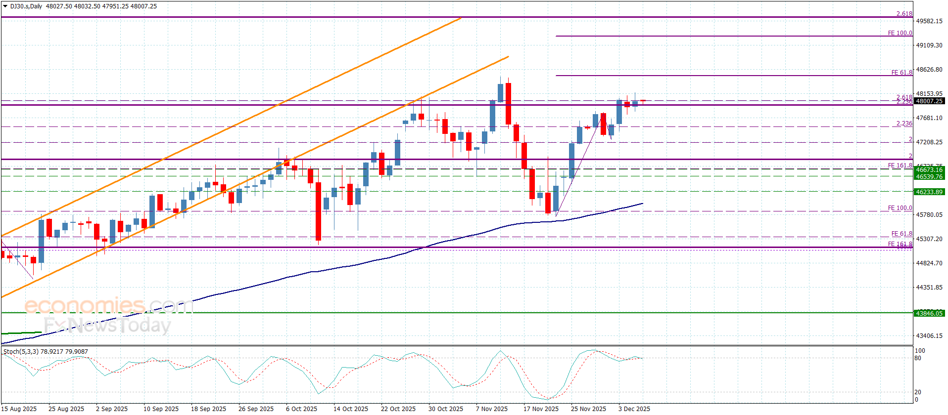 بدأ سعر المؤشر منذ تداولات يوم الجمعة بتشكيل بعض الموجات الصاعدة ليصدى بذلك لسلبية مؤشر ستوكاستيك والذي يحاول الخروج من مستوى تشبع الشراء لنلاحظ تسجيله لمستوى 25860.00.
