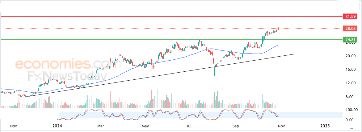 لهذا فتوقعاتنا تشير إلى استمرار صعود سعر السهم خلال تداولاته القادمة، طيلة ثبات مستوى الدعم 24.80$، ليستهدف مستوى المقاومة 31.60$.