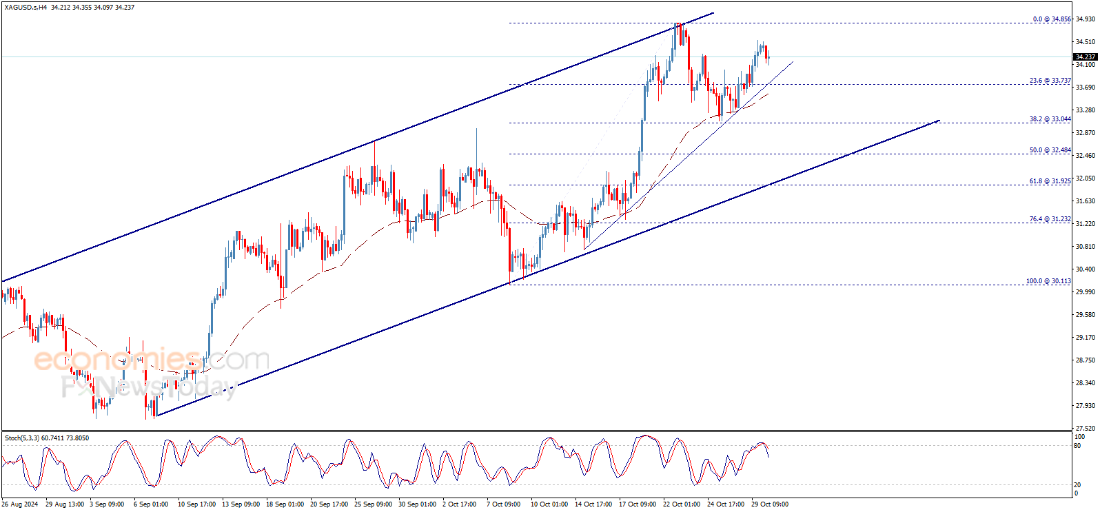 يظهر سعر الفضة بعض الميل الهابط الطفيف الآن، متأثراً بسلبية مؤشر ستوكاستيك، وطالما أن السعر فوق 33.70$، فإن توقعاتنا للاتجاه الصاعد ستبقى قائمة لهذا اليوم، بانتظار استئناف التداولات الإيجابية التي تستهدف مستوى 34.85$ كمحطة تالية.
