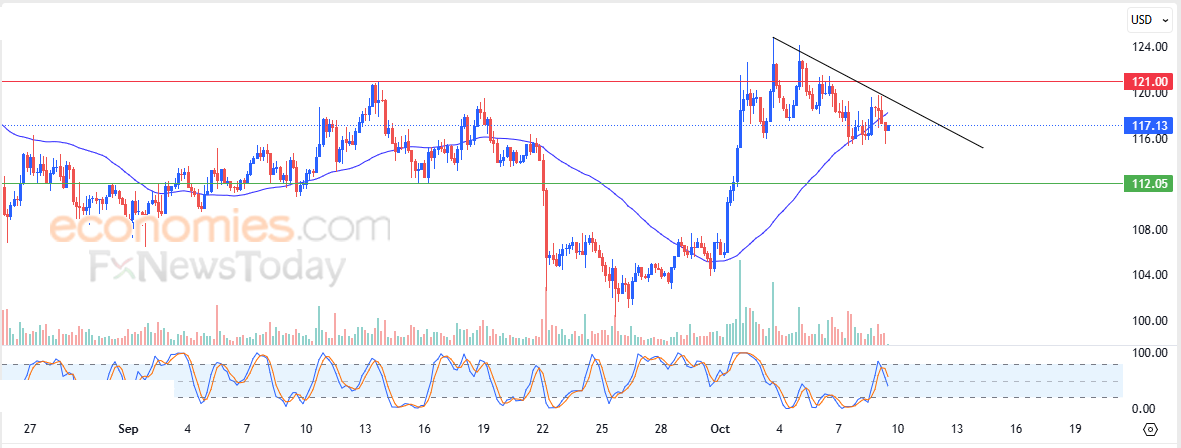 لهذا تشير توقعاتنا إلى انخفاض سعر العملة خلال تداولاته اللحظية القادمة، طيلة ثبات مستوى المقاومة 121.00$، ليستهدف مستوى الدعم 112.00$.