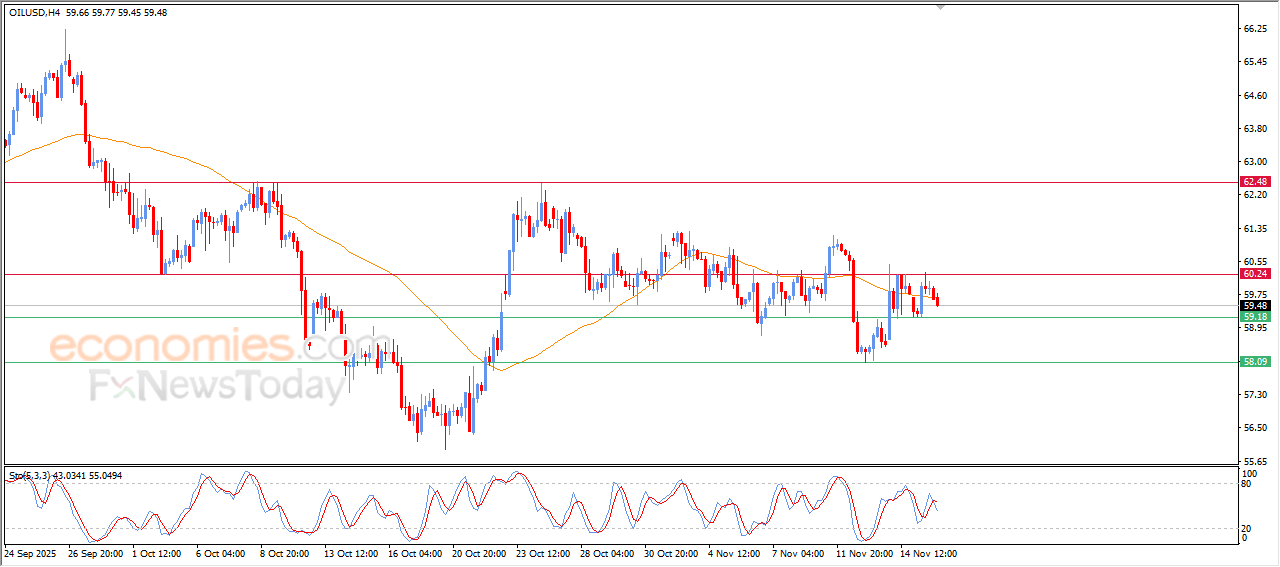 في المقابل نلاحظ بدء توارد إشارات سلبية على مؤشرات القوة النسبية، ما يرجّح استمرار الضغوط على السعر خلال الفترة القريبة، خاصة في ظل بقاء النفط تحت هيمنة الاتجاه الرئيسي الهابط على المدى القصير. هذا التلاقي بين الضعف الفني والإطار العام الهابط قد يدفع السعر نحو محاولات جديدة لكسر مستويات دعم قريبة ما لم يتمكن من تجاوز منطقة التداول الجانبية القائمة.