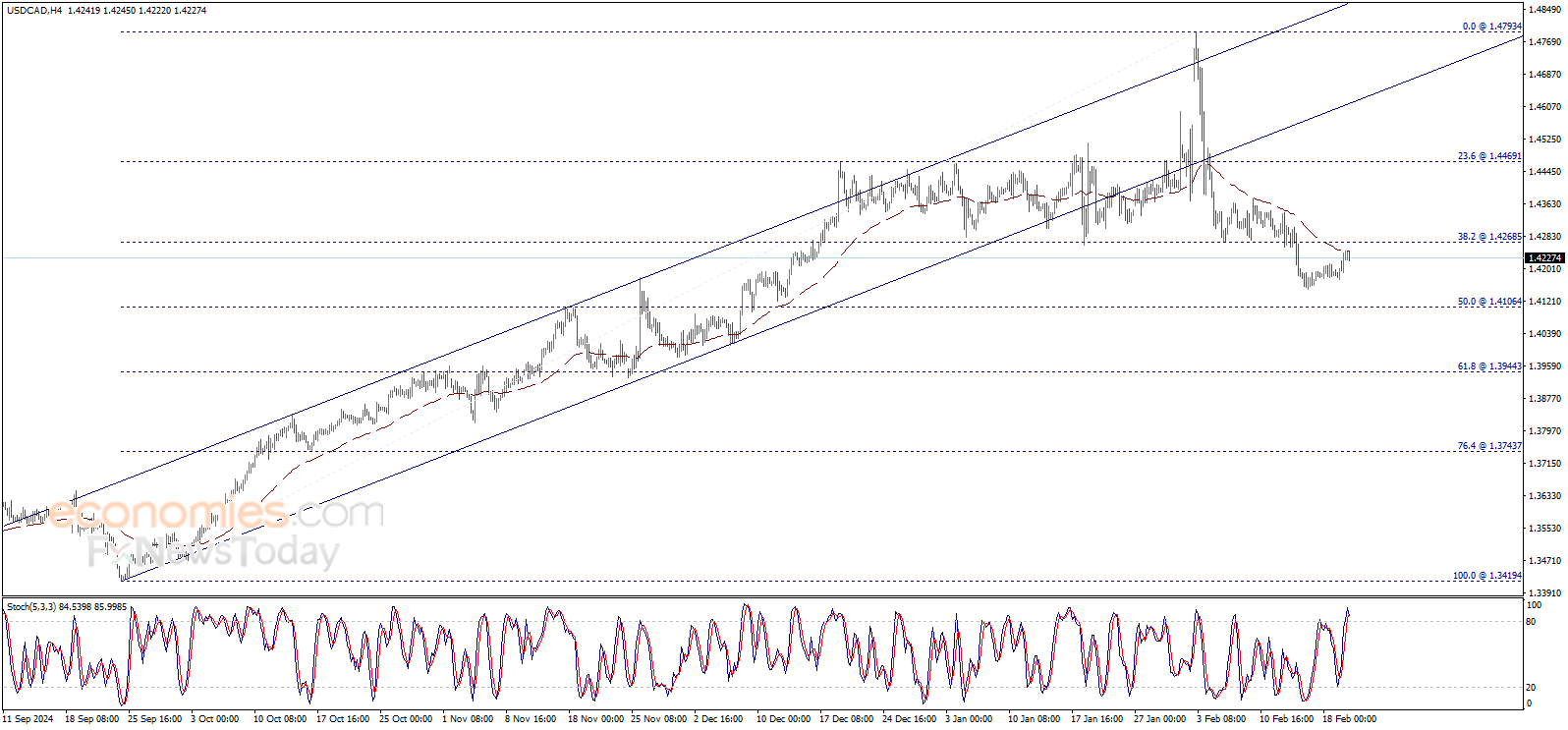 تداول سعر الدولار الأمريكي مقابل الدولار الكندي بإيجابية يوم أمس ليقترب من المقاومة المحورية 1.4268$، ونلاحظ أن المتوسط المتحرك 50 يشكّل مقاومة جيدة أمام السعر ليوقف التداولات الإيجابية، بينما يفقد مؤشر ستوكاستيك عزمه الإيجابي بشكل واضح.