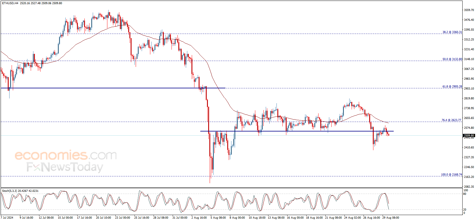 يعود سعر الإيثريوم (ETHUSD) للانخفاض بعد المحاولات الإيجابية التي قدّمها في الجلسات الماضية، ليستقر دون 2545.00$ من جديد، مما يدعم استمرار الاتجاه الهابط المتوقع على المدى اللحظي، والذي يستهدف مستويات 2340.00$ ثم 2168.74$ بشكل رئيسي.