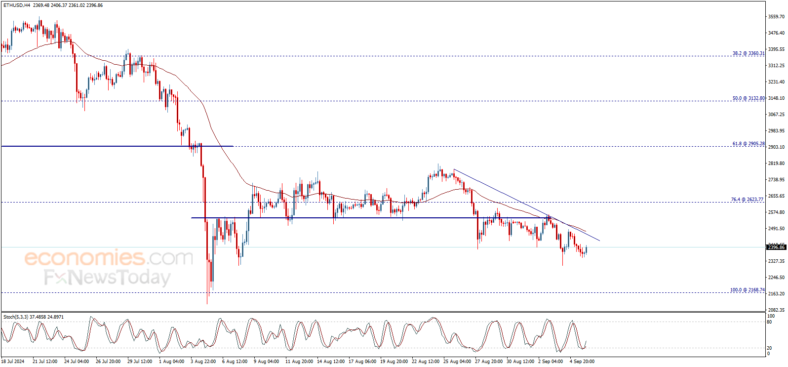 يظهر سعر الإيثريوم (ETHUSD) تداولات إيجابية مع افتتاح اليوم، وقد يتجه لاختبار خط الاتجاه اللحظي الهابط الذي يتواجد الآن عند 2463.00$ قبل العودة للانخفاض من جديد، متأثراً بإيجابية مؤشر ستوكاستيك.