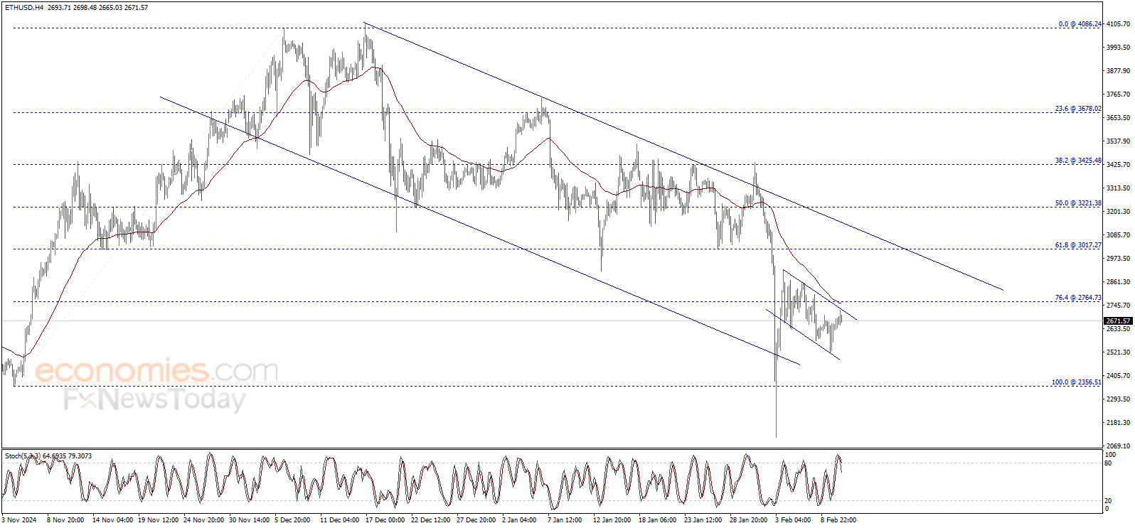 ارتدت تداولات سعر الإيثريوم (ETHUSD) صعوداً بشكل ملحوظ بعد الاقتراب من حاجز 2500.00$، ليختبر مقاومة القناة الفرعية الهابطة التي تظهر بالرسم البياني، ونلاحظ أن المؤشرات الفنية تقدّم إشارات سلبية قد تجبر السعر على الانخفاض من جديد.