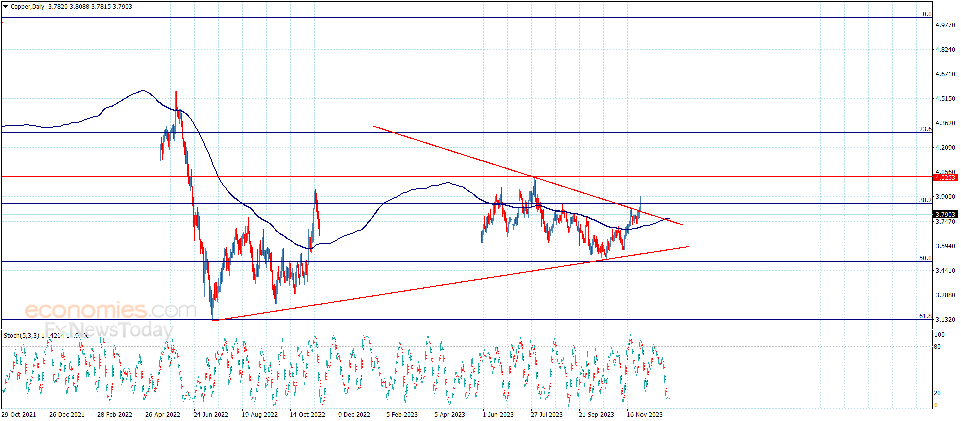 لا يزال سعر النحاس متأثرا بتعارض المؤشرات الرئيسية مؤجلا بذلك الاندفاع الصاعد لنلاحظ تذبذبه بشكل مستمر قرب الدعم الإضافي الممتد نحو 3.7500, نشير إلى أن ثبات المتوسط المتحرك 55 قرب هذا الدعم سيدعم الترجيح الصاعد بتشكيله لعائق أمام محاولة استئناف الهبوط التصحيحي للفترة الحالية.