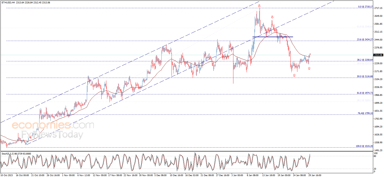 تمكّن سعر الإيثريوم (ETHUSD) من اختراق مستوى 2305.00 ويحاول الثبات فوقه، معززاً التوقعات باستمرار الاتجاه الصاعد خلال الجلسات القادمة، مع التذكير بأننا بانتظار التوجه نحو 2434.27 كهدف رئيسي تالي.