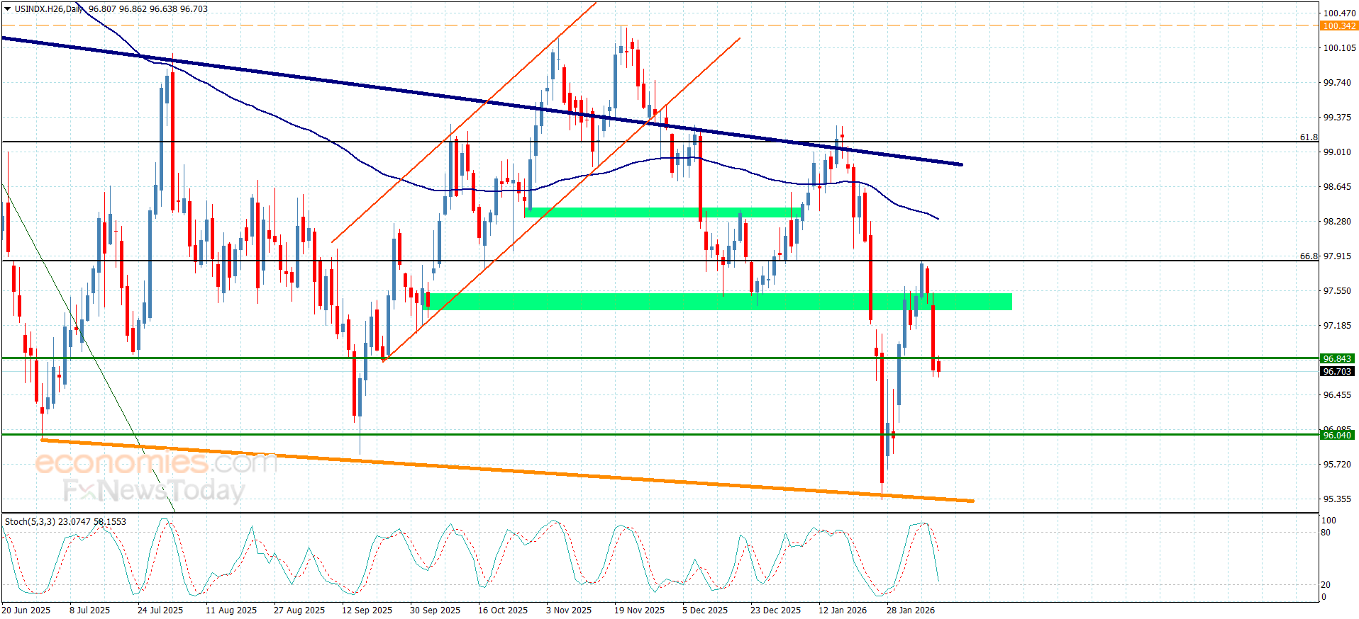 تفاعل سعر المؤشر مجددا مع سلبية مؤشر ستوكاستيك لنلاحظ تشكيله لتداولات سلبية جديدة بتسلله حاليا نحو 96.70 ليبتعد بذلك عن الحاجز المستقر قرب 97.30.