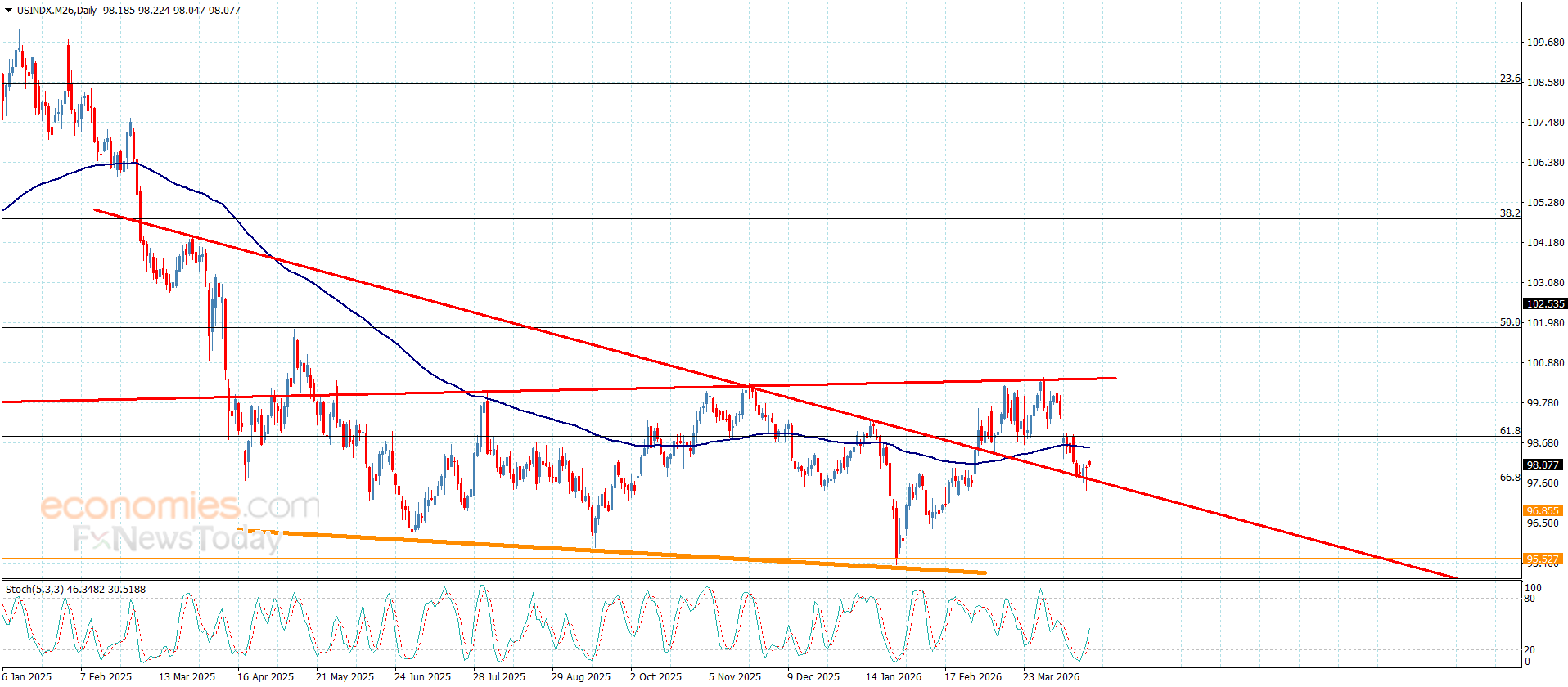 استغل سعر المؤشر اندفاع مؤشر ستوكاستيك نحو مستوى 50 ليكرر بذلك الثبات الإيجابي فوق الدعم الإضافي المتمثل بمستوى 97.55 لنلاحظ محاولة تسجيله لبعض المكاسب بتذبذبه قرب 98.10.
