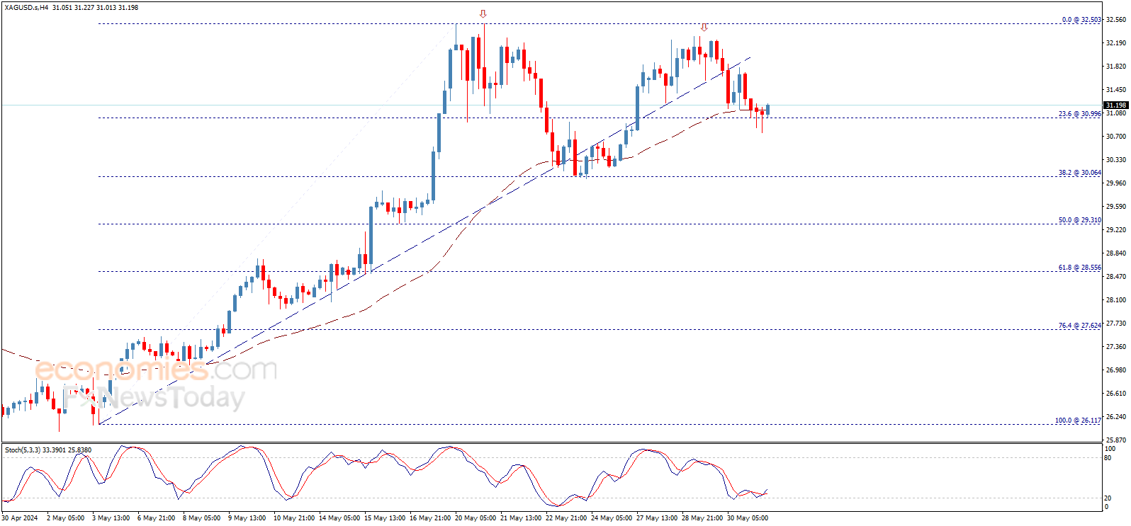 يجد سعر الفضة دعم قوي عند مستوى 31.00$، ليظهر بعض الميل الصاعد الآن، متأثراً بإيجابية مؤشر ستوكاستيك، وطالما أن السعر دون 31.75$، فإن توقعاتنا للاتجاه الهابط ستبقى قائمة لهذا اليوم، بانتظار الحصول على حافز سلبي يساهم بتأكيد كسر الدعم المذكور ومن ثم فتح الطريق أمام الاندفاع نحو 30.06$ كهدف رئيسي تالي.