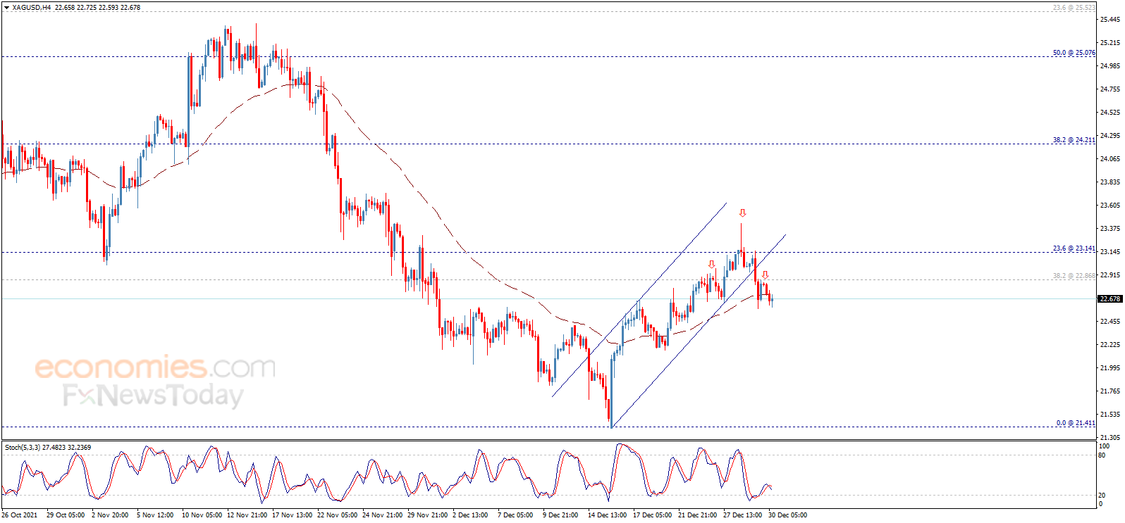 تستقر تداولات سعر الفضة دون المتوسط المتحرك 50، وبتدقيق النظر في الرسم البياني، نجد بأن السعر يرسم نموذج رأس وكتفين ننتظر أن يساهم بدفع السعر للاندفاع هبوطاً نحو هدفنا السلبي المتوقع عند 22.00.
