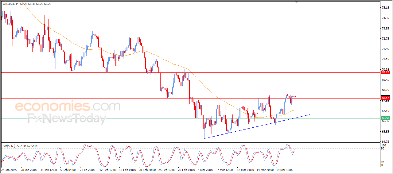 استقرت أسعار النفط الخام (Crude Oil) على ارتفاع خلال التداولات الأخيرة على المستويات اللحظية، متماسكة أعلى مستوى المقاومة المحوري 68.00$ مما يعزز احتمالية اختراقه، ويأتي ذلك في ظل سيطرة الاتجاه التصحيحي الصاعد على المدى القصير وتداولاته بمحاذاة خط ميل، إلى جانبي الدعم الإيجابي الناتج عن استقرار السعر أعلى متوسطه المتحرك البسيط لفترة 50 شمعة سابقة.