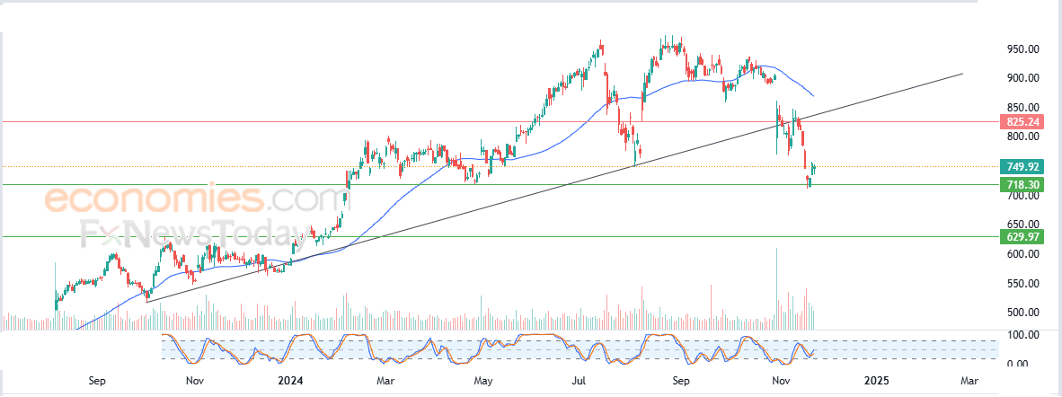 لذلك نحن نتوقع المزيد من الهبوط لسعر السهم خلال تداولاته القادمة، خاصة في حالة كسره لمستوى الدعم 718.30$، ليستهدف بعدها مستوى الدعم 630.00$.