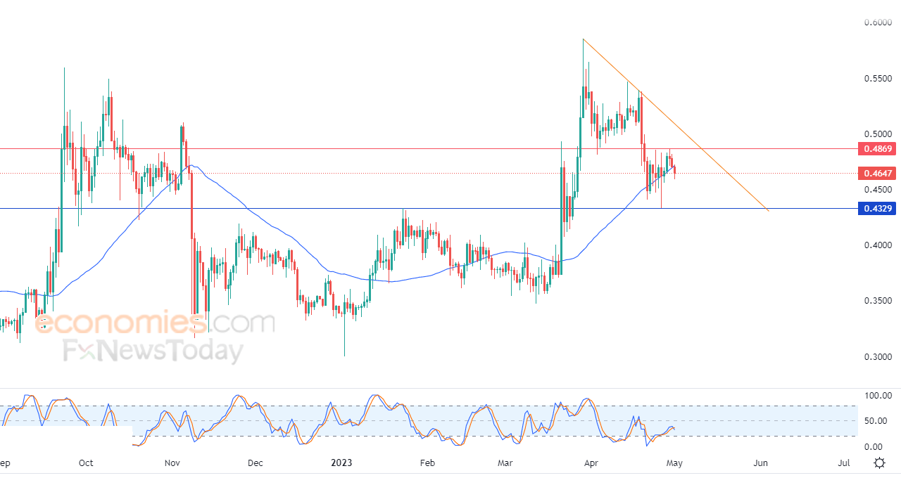 لهذا تشير توقعاتنا إلى المزيد من الانخفاض للزوج خلال تداولاته القادمة، طيلة استقراره دون مستوى المقاومة 0.4869، ليستهدف مستوى الدعم المهم 0.4329 استعداداً لكسره.