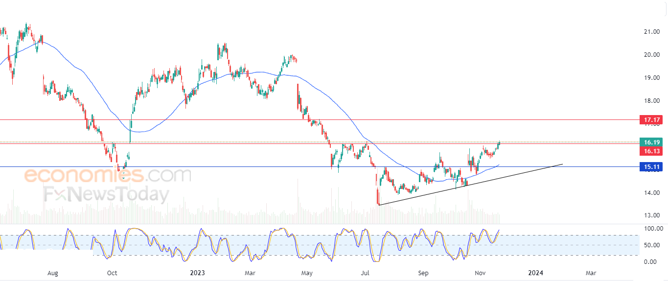 لهذا تشير توقعاتنا إلى المزيد من الصعود للسهم خلال تداولاته القادمة، خاصة في حالة اختراقه للمقاومة 16.13، ليستهدف بعدها مباشرة أولى مستويات المقاومة عند 17.17.