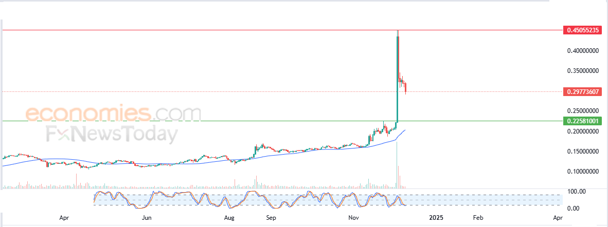 لذلك فتوقعاتنا ترجح عودة صعود سعر العملة خلال تداولاته القادمة، طيلة ثبات مستوى الدعم 0.22581001$، ليستهدف من جديد مستوى المقاومة المهم 0.45055235$.