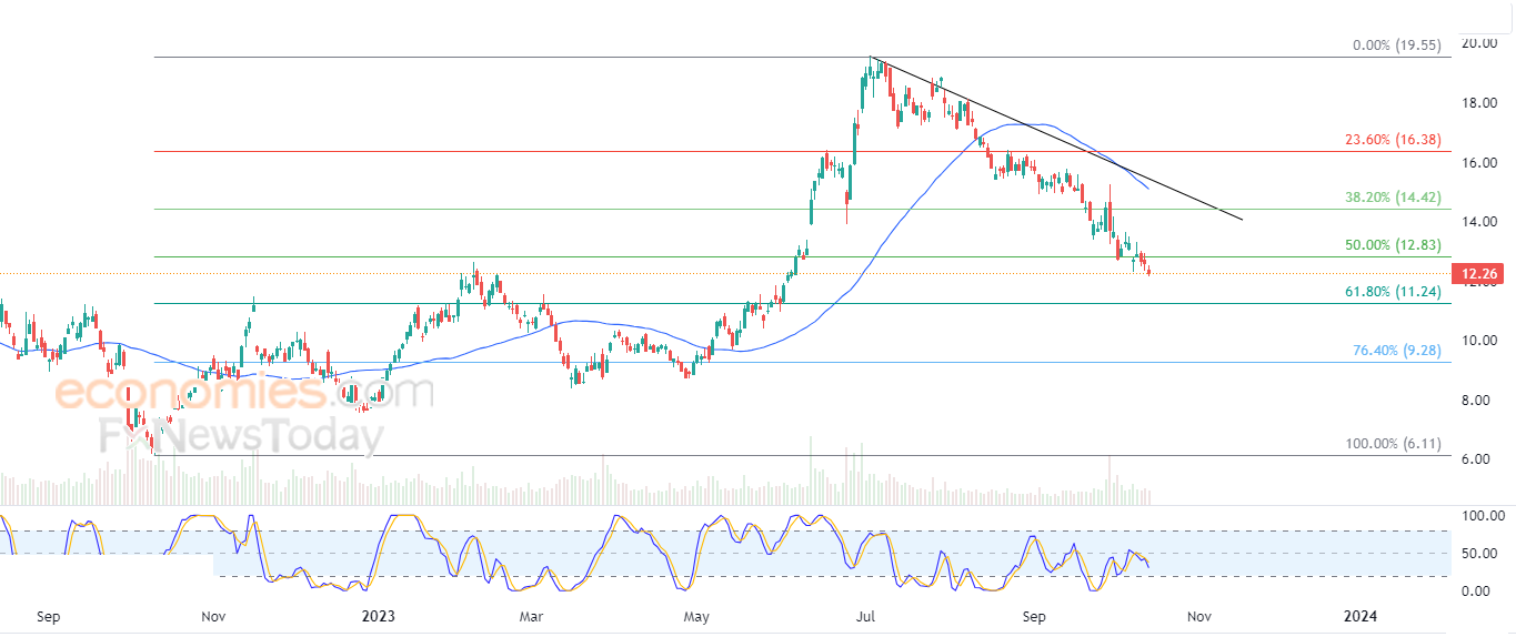 لذلك فتوقعاتنا تشير إلى المزيد من الانخفاض للسهم خلال تداولاته القادمة، خاصة طيلة استقراره دون مستوى المقاومة 12.83، ليستهدف مستوى الدعم التالي من تلك المتتالية التصحيحية لفيبوناتشي عند سعر 11.24 والذي يمثل نسبة 61.8% منها.