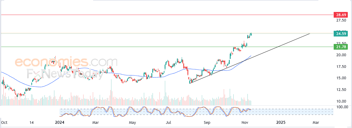 لهذا فتوقعاتنا تشير إلى المزيد من الصعود لسعر السهم خلال تداولاته القادمة، طيلة ثبات مستوى الدعم 21.80$، ليستهدف مستوى المقاومة 28.70$.