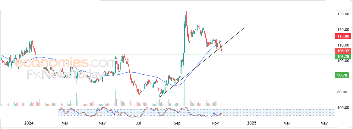 لهذا فتوقعاتنا تشير إلى المزيد من الهبوط لسعر السهم خلال تداولاته القادمة، خاصة في حالة كسره للدعم 103.75$، ليستهدف بعدها مستوى الدعم 90.80$.