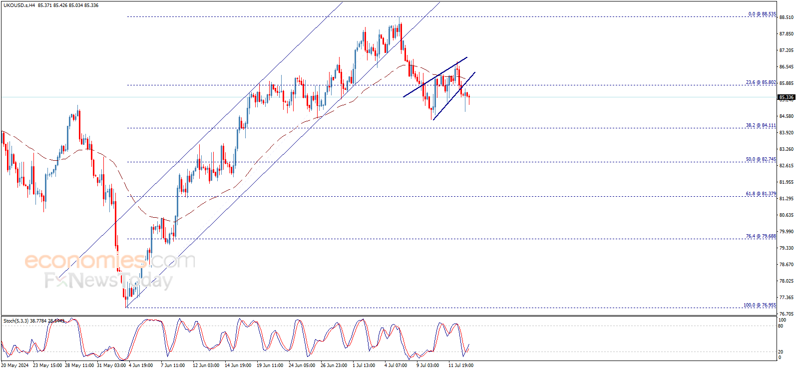 تستقر تداولات سعر عقود خام برنت دون مستوى 85.80$، ويشكّل المتوسط المتحرك 50 ضغط سلبي أمام السعر، وبالتالي، لا تغيير على سيناريو الاتجاه الهابط المتوقع لهذا اليوم، والذي يعتمد على الثبات دون مستوى 85.80$، مع التذكير بأن أهدافنا تبدأ عند 84.10$ وتمتد إلى 82.74$ في حال نجح السعر بكسر المستوى السابق.