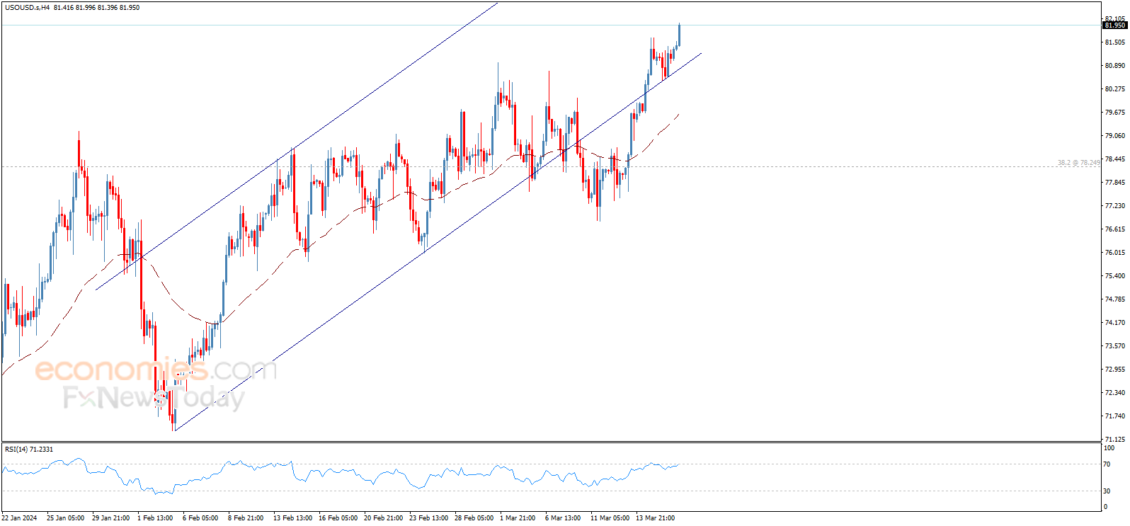 يواصل سعر النفط الارتفاع ليلامس حاجز 82.00 دولار، معززاً التوقعات باستمرار الاتجاه الصاعد ضمن القناة الصاعدة التي تظهر بالرسم البياني، بانتظار زيارة مستوى 82.60 الذي يمثّل هدفنا التالي، مع التذكير بأن اختراقه سيمد الموجة الصاعدة لتصل إلى 83.85.