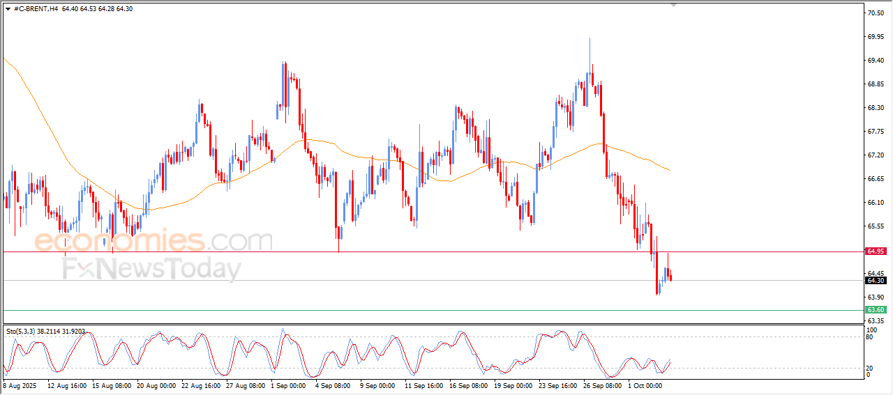 تراجع سعر النفط خام برنت (Brent) بتداولاته الأخيرة على المستويات اللحظية، وذلك على اثر ثبات مستوى المقاومة المحوري 64.95$، ما عرضه للضغط السلبي بعدما نجح في تصريف تشبعه البيعي بمؤشرات القوة النسبية، ما زاد الضغط السلبي حوله، خاصة ويأتي هذا في ظل استمرار تداولاته دون متوسطه المتحرك البسيط لفترة 50، وتحت سيطرة الاتجاه الهابط على المدى القصير.