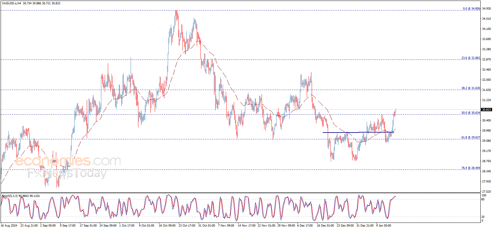 تمكّن سعر الفضة من اختراق مستوى 30.63$ ليؤكد استمرار سيطرة الاتجاه الصاعد خلال الجلسات القادمة، فاتحاً الطريق أمام التوجه نحو 31.63$ كمحطة إيجابية تالية، مع الإشارة إلى أن المتوسط المتحرك 50 يدعم الموجة الصاعدة المقترحة، والتي ستبقى قائمة بشرط الثبات فوق مستوى 30.63$.