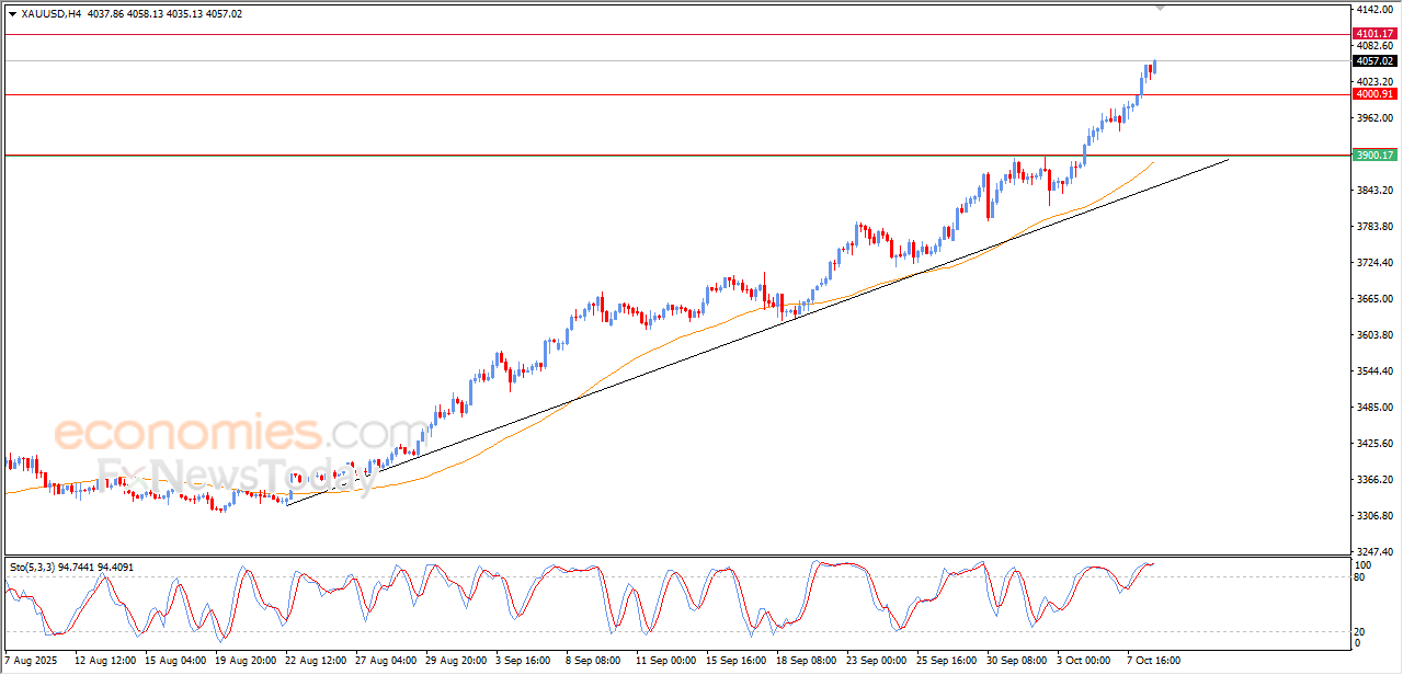 سجل سعر الذهب (GOLD) مستويات قياسية جديدة على المدى اللحظي، في ظل استقرار تداولاته أعلى سعر 4,000$، مدفوعاً بتداولاته أعلى متوسطه المتحرك البسيط لفترة 50، وتحت سيطرة الاتجاه الرئيسي الصاعد على المدى القصير وتداولاته بمحاذاة خط ميل، ولكن في المقابل نلاحظ بدء توارد الإشارات السلبية بمؤشرات القوة النسبية، بعد وصولها لمناطق شديدة التشبع بعمليات الشراء، وهو ما كبح من مكاسبه الأخيرة.