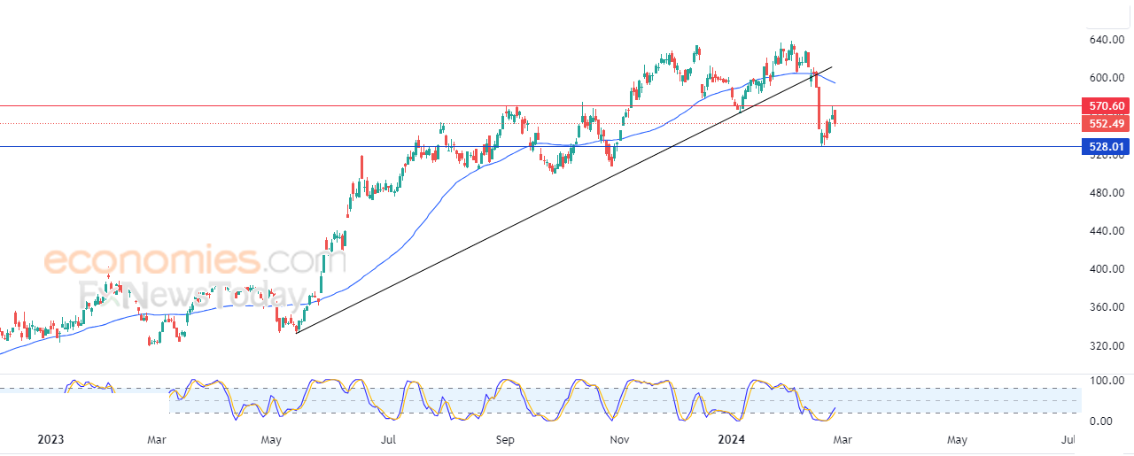 لهذا تشير توقعاتنا إلى المزيد من الانخفاض للسهم خلال تداولاته القادمة، طيلة ثبات المقاومة 570.60، ليستهدف مستوى الدعم 528.00.