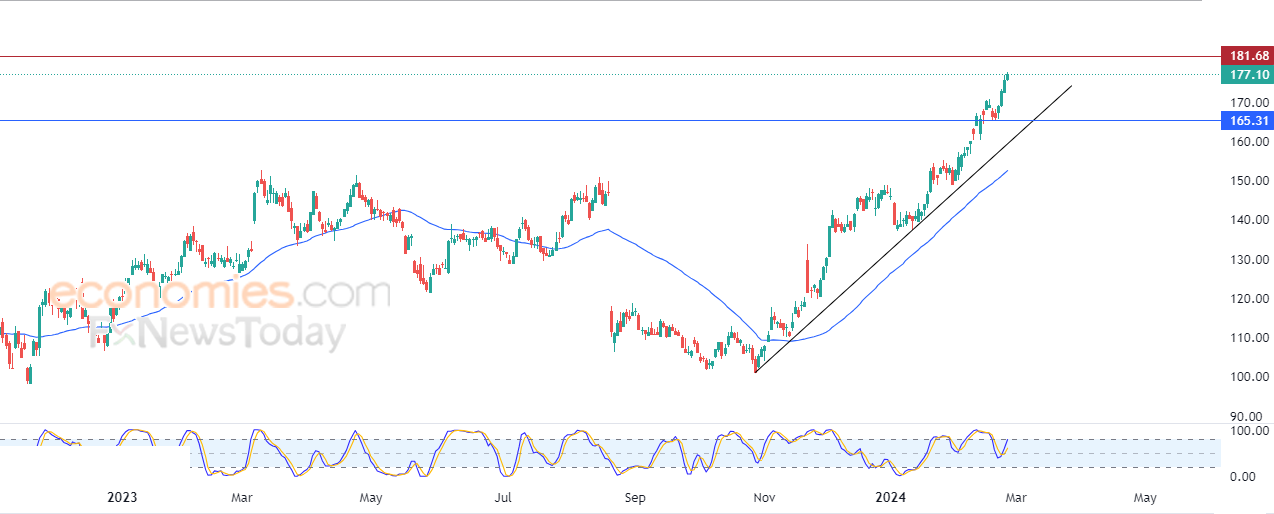 كل تلك العوامل الإيجابية تدعونا نتوقع استمرار صعود السهم خلال تداولاته القادمة، ليستهدف مستوى المقاومة القريب 181.65.