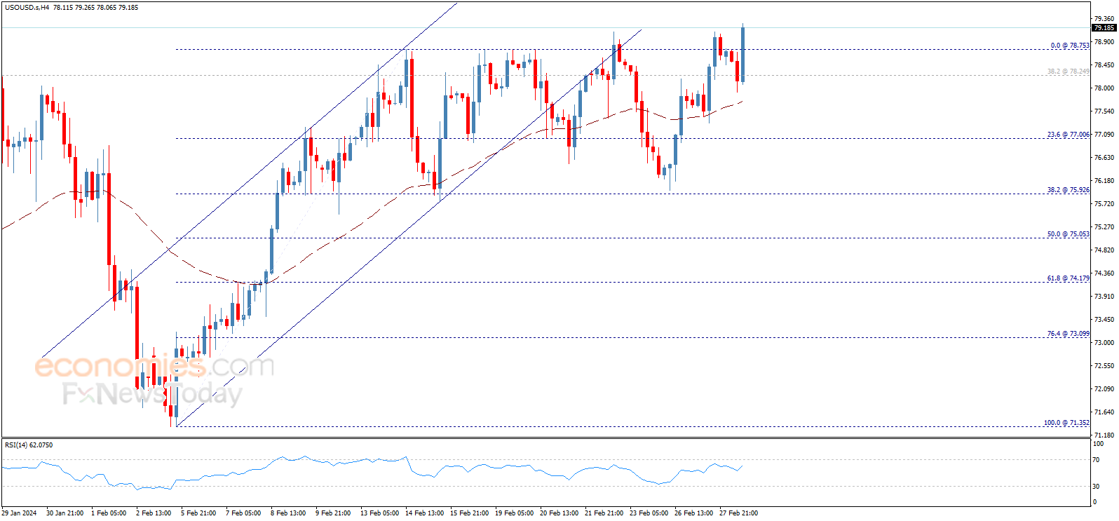 استأنف سعر النفط تداولاته الإيجابية بقوة ليخترق مستوى 78.75 ويحاول الثبات فوقه، ليعيد تفعيل سيناريو الاتجاه الصاعد الذي يستهدف مستوى 80.00 كمحطة تالية، مع الإشارة إلى أن اختراق هذا المستوى سيدفع السعر نحو 81.15 كهدف رئيسي تالي، بينما يمثّل الثبات فوق 78.25 شرط مهم لتحقيق هذه الأهداف.