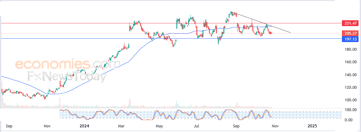 لذلك فتوقعاتنا ترجح عودة الهبوط التصحيحي لسعر السهم خلال تداولاته القادمة، طيلة ثبات مستوى المقاومة 221.50$، ليستهدف مستوى الدعم 197.13$.
