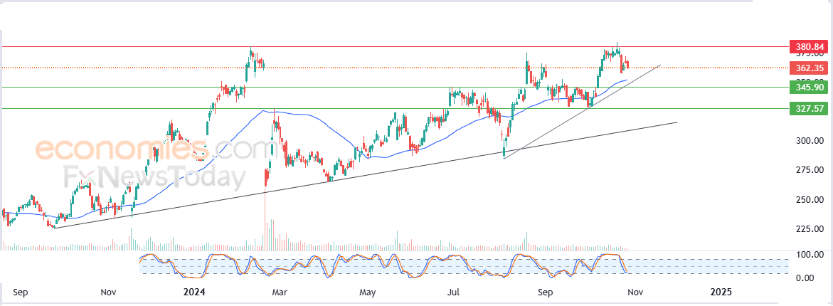 لهذا نحن نرجح عودة صعود سعر السهم خلال تداولاته القادمة، طيلة ثبات مستوى الدعم 345.90$، ليستهدف مستوى المقاومة المحوري 380.84$.
