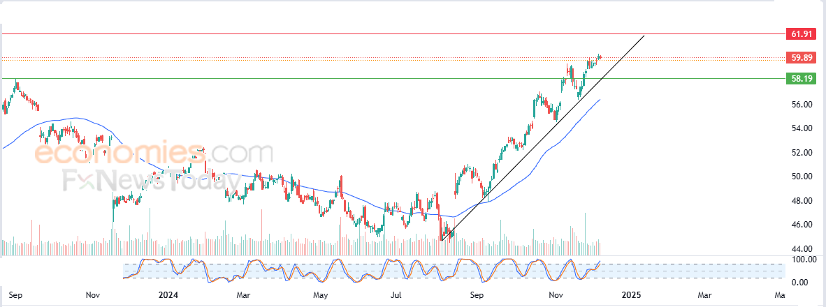 لذلك فتوقعاتنا ترجح عودة صعود سعر السهم خلال تداولاته القادمة، طيلة استقراره اعلى مستوى الدعم 58.19$، ليستهدف مستوى المقاومة 61.90$.