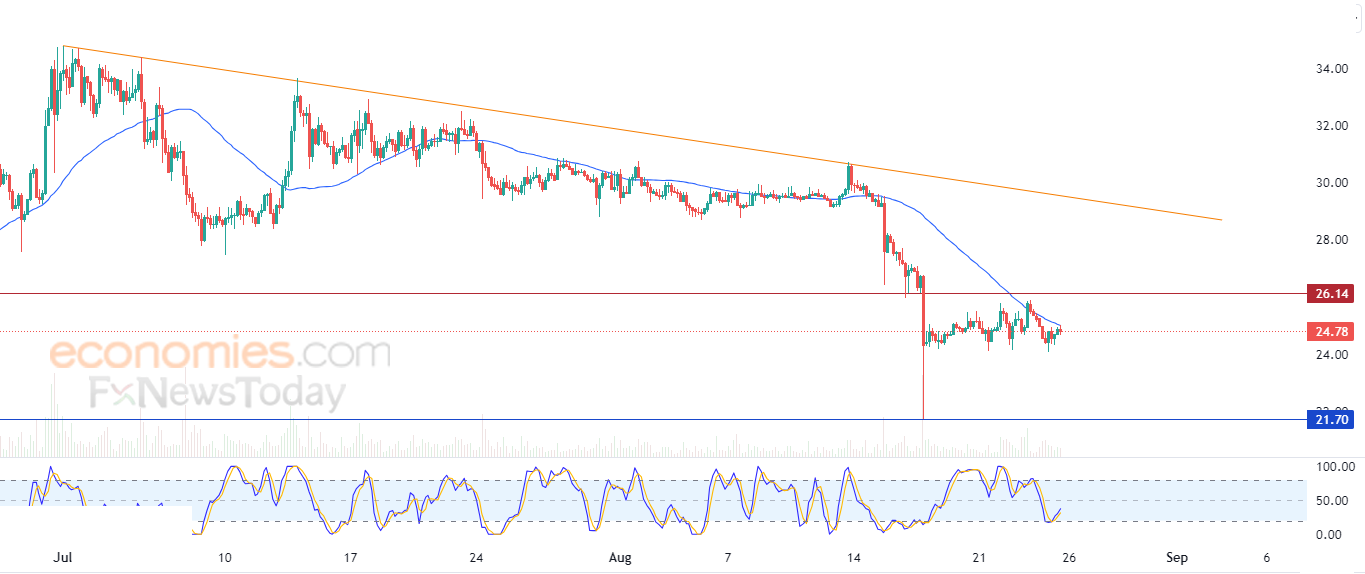 لذلك تشير توقعاتنا إلى انخفاض الزوج خلال تداولاته القادمة، طيلة استقراره دون مستوى المقاومة 26.14، ليستهدف مستوى الدعم 21.70.