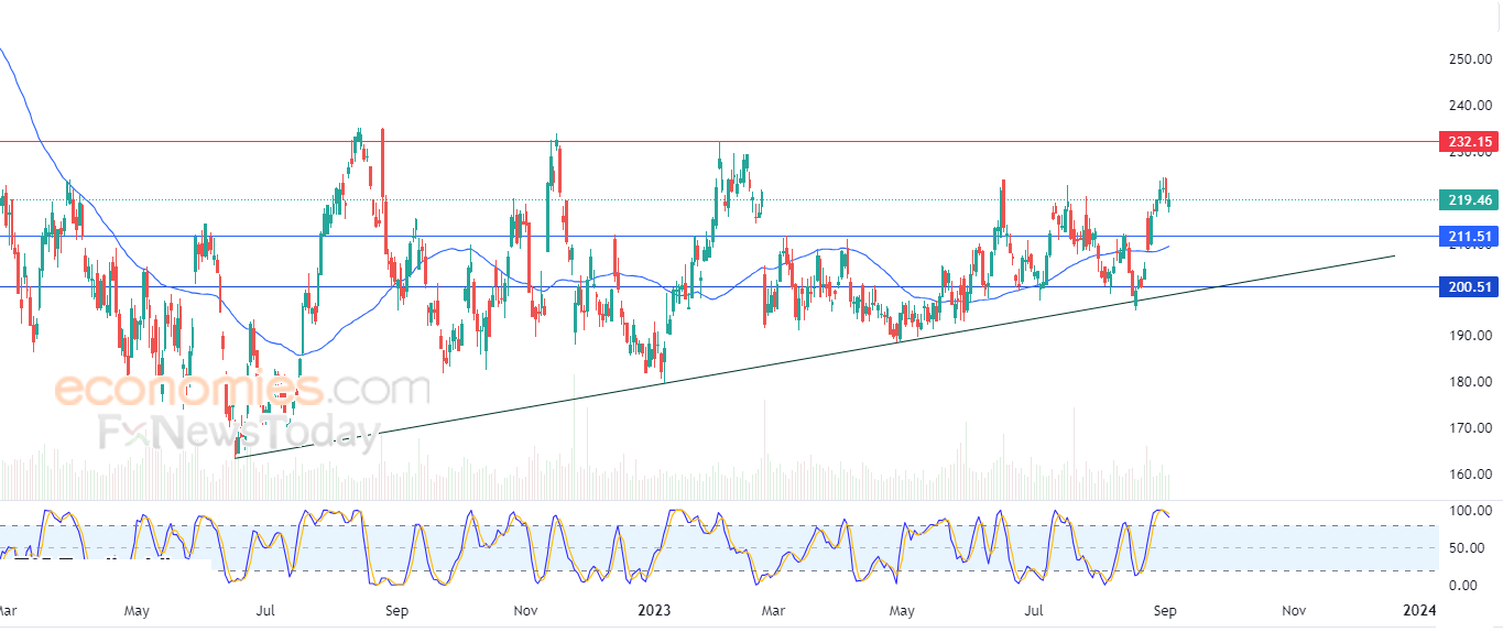 لهذا نحن نرجح عودة ارتفاع السهم خلال تداولاته القادمة، طيلة استقراره فوق مستوى 211.50، ليستهدف مستوى المقاومة المحوري 232.15.
