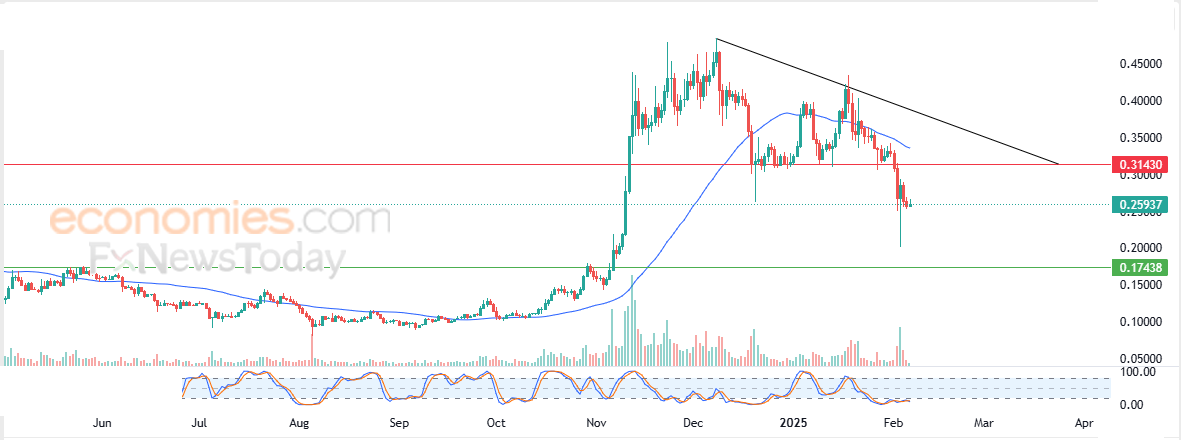 لهذا نحن نتوقع انخفاض سعر العملة خلال تداولاته القادمة، طيلة ثبات مستوى المقاومة 0.31430$، ليستهدف مستوى الدعم 0.17438$.