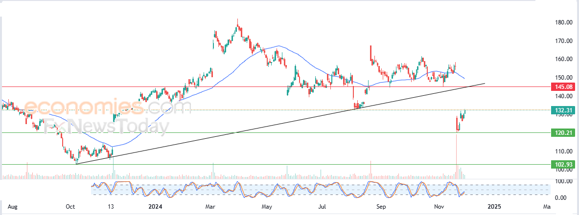 لذلك فتوقعاتنا ترجح عودة هبوط سعر السهم خلال تداولاته القادمة، طيلة ثبات مستوى المقاومة 145.00$، ليستهدف أولى مستويات الدعم عند سعر 120.20$.