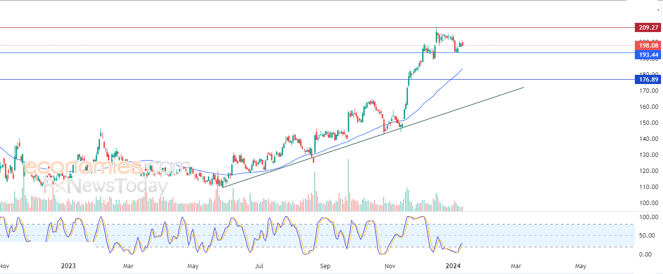 لذلك فتوقعاتنا ترجح عودة ارتفاع السهم خلال تداولاته القادمة، طيلة ثبات الدعم 193.44، ليستهدف من جديد مستوى المقاومة 209.27 استعداداً لمهاجمته.