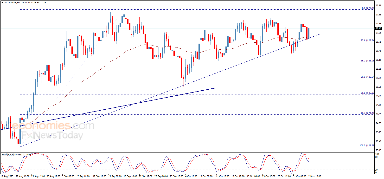 سلبية مؤشر ستوكاستيك الحالية قد تبطئ مهمة السعر بالارتفاع، مع التذكير بأن استمرار الموجة الصاعدة يعتمد على الثبات فوق مستوى 26.74.