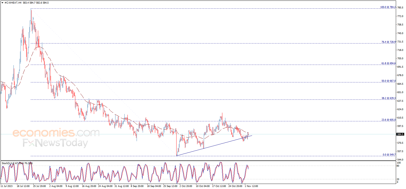 عاد سعر القمح للتداول فوق خط الاتجاه اللحظي الصاعد الذي يظهر بالرسم البياني، ليتجه نحو محاولة بناء موجة صاعدة نتوقّع أن تصل إلى مناطق 605.00 بشكل رئيسي.