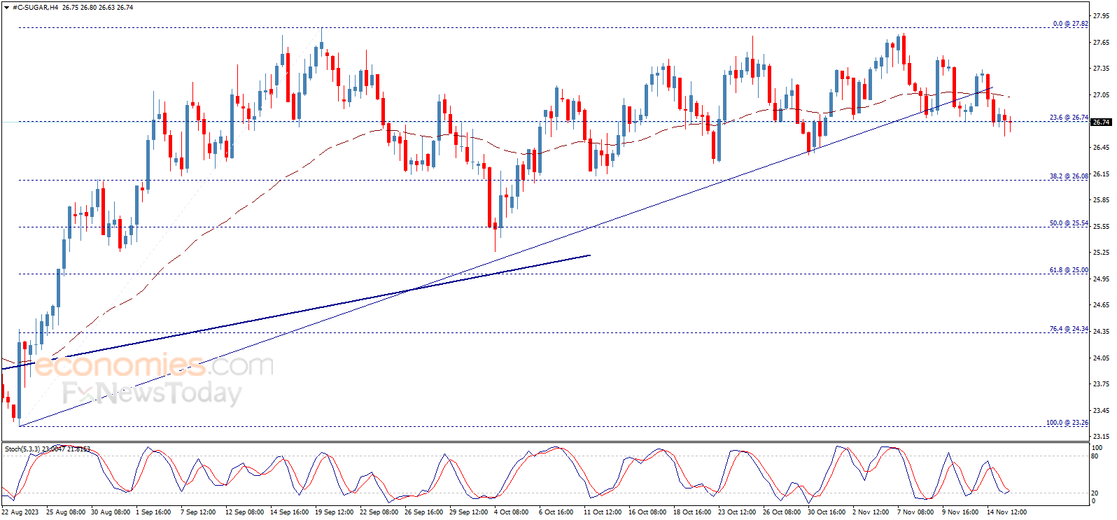 يتذبذب سعر السكر حول مستوى 26.74 ويحافظ على ثباته فوقه حتى الآن، بالتزامن مع ظهور إشارة تقاطع إيجابي من خلال مؤشر ستوكاستيك، بانتظار تحفيز السعر على استئناف الاتجاه الصاعد المتوقع للفترة القادمة، مع التذكير بأن هدفنا التالي يتواجد عند 27.82.