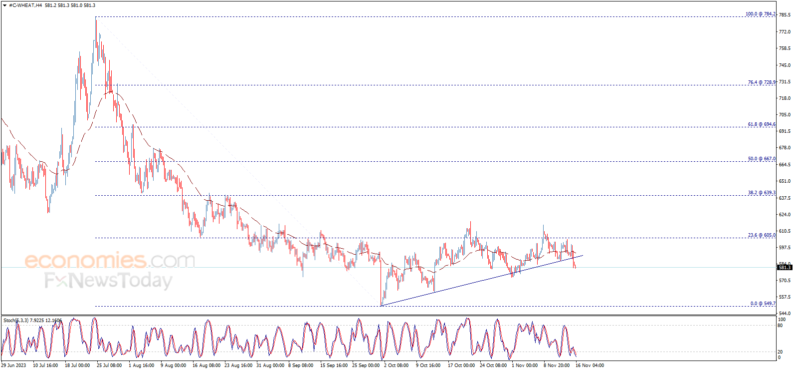 حقق سعر القمح كسراً واضحاً لخط الاتجاه الصاعد الذي يظهر بالرسم البياني، ليوقف السيناريو الإيجابي المقترح في تقاريرنا الأخيرة ويتجه نحو بناء موجة هابطة تستهدف زيارة مستويات 572.50 ثم 549.70 كمحطات رئيسية تالية.
