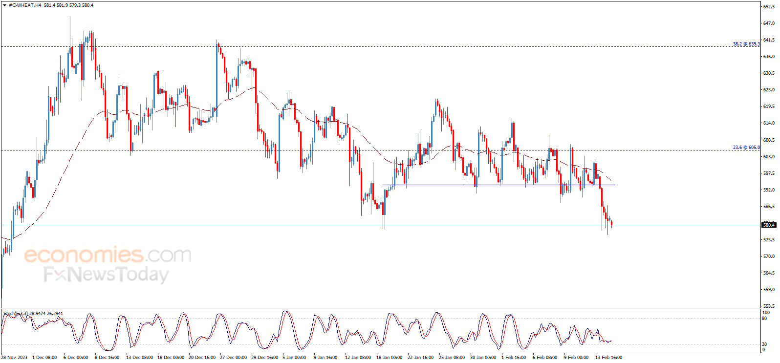 تداول سعر القمح بسلبية ملحوظة يوم أمس ليلامس هدفنا الأول المنتظر عند 580.00 ويستقر عنده، ونتوقّع استمرار سيطرة الاتجاه الهابط خلال الجلسات القادمة لتحقيق أهداف سلبية إضافية تصل إلى 560.00، متأثراً بالتركيبة الفنية السلبية التي تظهر بالرسم البياني.