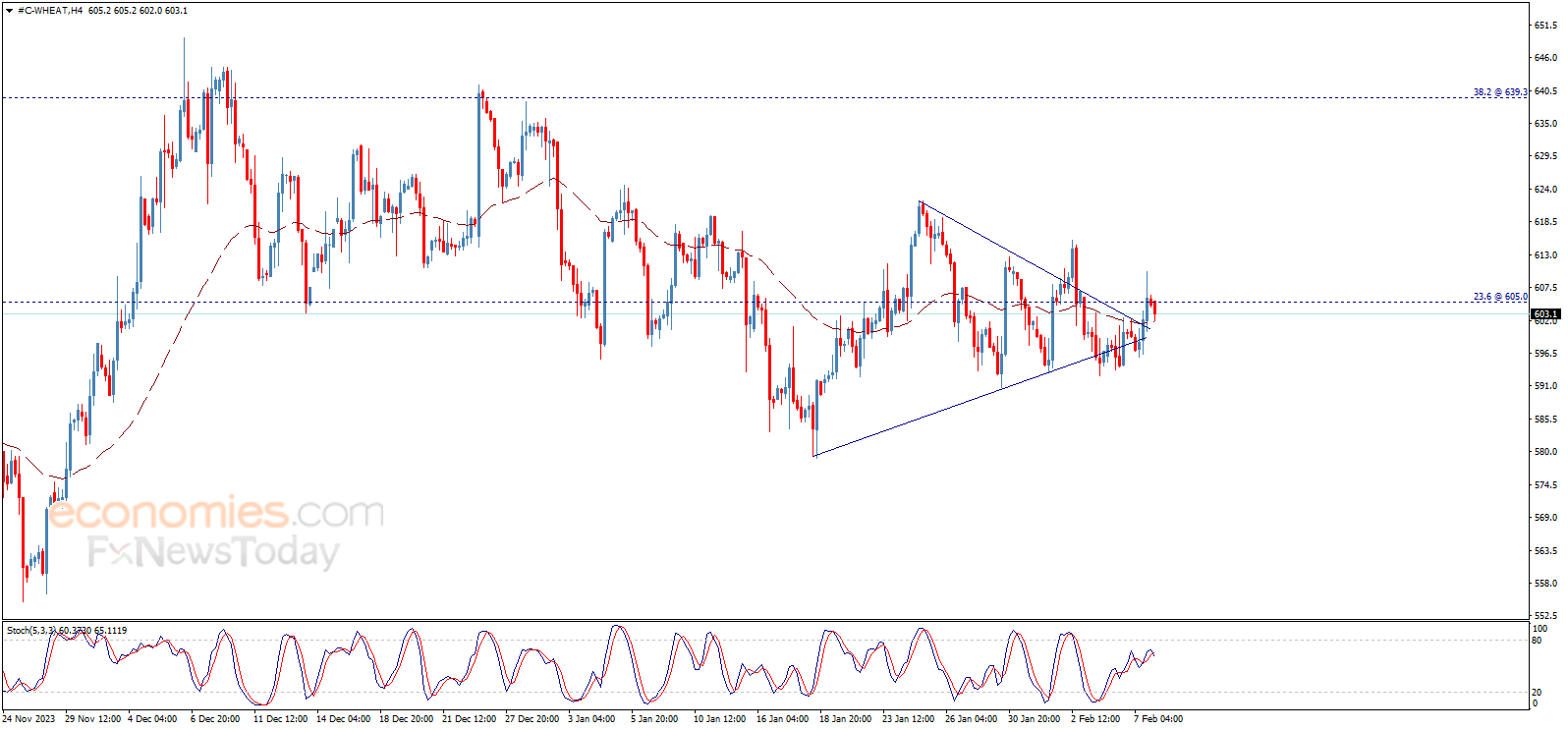 تداول سعر القمح بإيجابية ملحوظة يوم أمس ليختبر المقاومة المحورية 605.00 وحاول اختراقها، لكنه حافظ على ثبات الإغلاق اليومي دونها، ليبقى سيناريو الاتجاه الهابط فعالاً للفترة القادمة، والذي يستهدف مناطق 580.00 كمحطة رئيسية تالية.