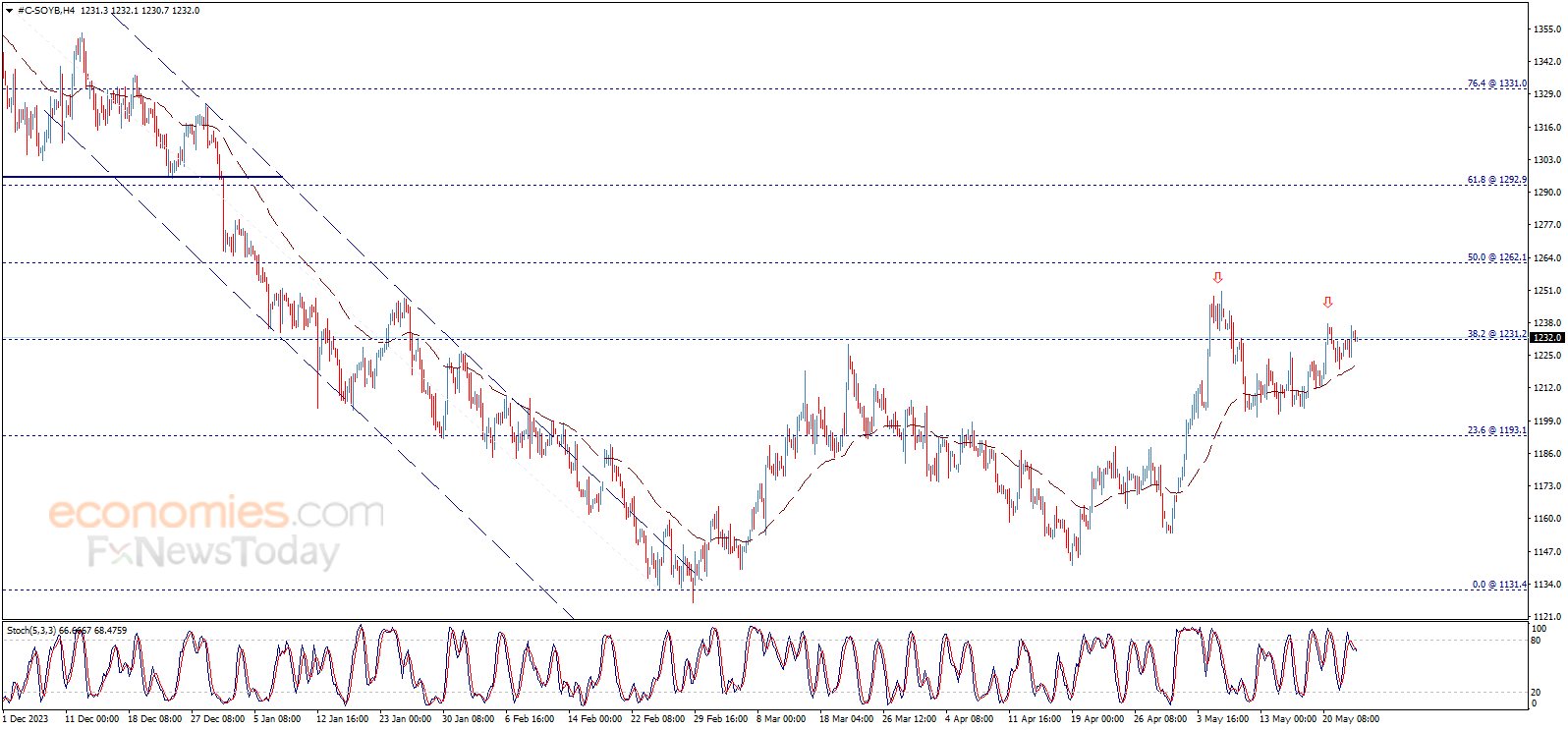 يحوم سعر فول الصويا حول مستوى 1231.20$، ويحاول التماسك دونه، بينما يقدّم مؤشر ستوكاستيك إشارات سلبية ننتظر أن تحفّز السعر على استئناف الاتجاه الهابط المتوقع على المدى اللحظي، والذي يستهدف مستوى 1193.10$ كمحطة تالية.