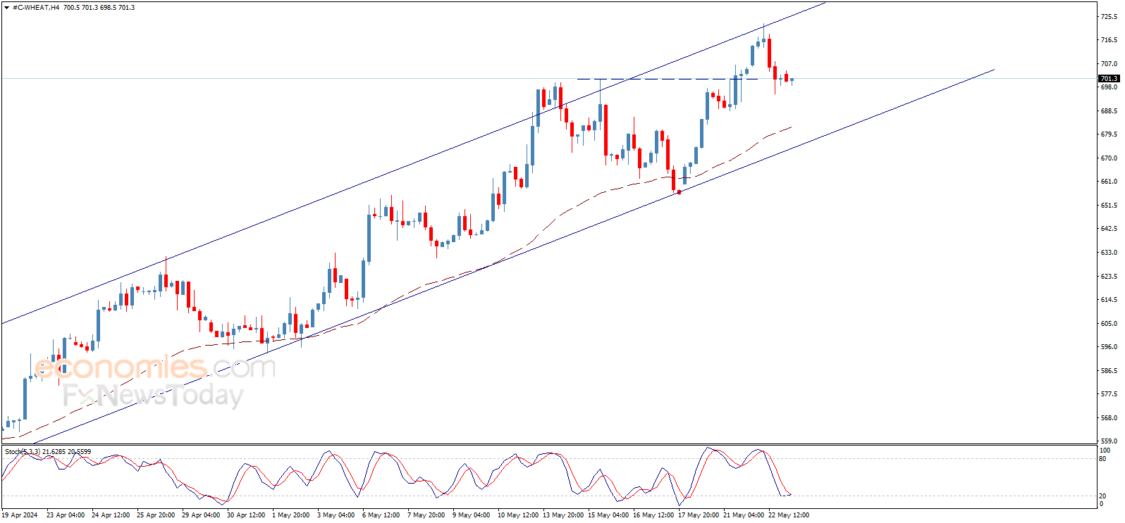 ارتدت تداولات سعر القمح هبوطاً بعد ملامسة مقاومة القناة الصاعدة التي تظهر بالرسم البياني، ليبدأ موجة هابطة ويتجه نحو زيارة دعم هذا القناة حول 674.50$.