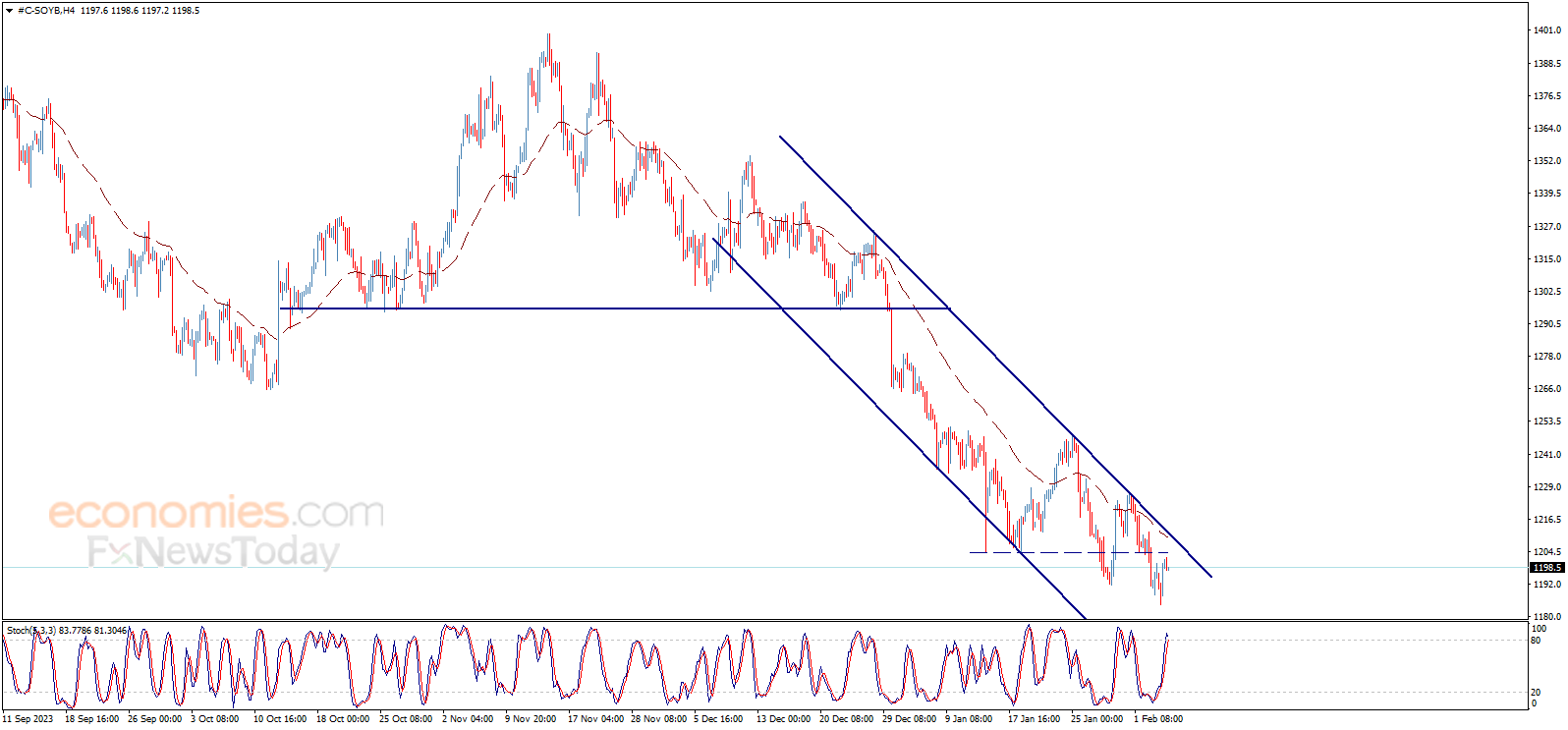 ارتدت تداولات سعر فول الصويا صعوداً بشكل ملحوظ يوم أمس ليختبر حاجز 1200.00، ويستمر بالتحرّك داخل القناة الهابطة التي تظهر بالرسم البياني، ويلتقي المتوسط المتحرك 50 مع مقاومة هذه القناة ليدعم استمرار الاتجاه الهابط المتوقع على المدى اللحظي والقصير، والذي يتواجد هدفه التالي عند 1171.50.